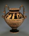 Two-handled vessel (nestoris) depicting athletes in conversation with girls