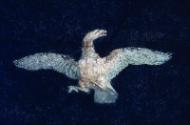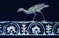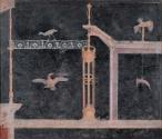 The walls of elite Roman houses were often covered with fresco paintings whose designs ranged from imitation colored marbles and architectural vistas to landscapes and mythological stories. These two panels, once contiguous, were part of the decoration of a room that opened off a colonnaded courtyard, or peristyle, in the seaside Villa at Fondo Bottaro about half a mile south of Pompeii, which was buried and preserved in the eruption of Mount Vesuvius on August 24, A.D. 79. The MFA's collection also includes sections of wall painting from the peristyle and other rooms of the house, as well as additional elements of the domestic décor (see p. 168).The panels illustrated here, whose polished black pigment was produced from charcoal or soot, exemplify what is commonly known as the third style of Roman wall painting, characterized by whimsical simulated architecture and isolated figures and motifs floating against large expanses of a single color. Extremely popular in the early Imperial period, paintings similar to these also adorned the walls of a villa associated with the family of Augustus, Rome's first emperor. On the left panel, a tragic mask hangs from a doorway, indicating an interest in illusion and the theater. The right panel features a golden tripod supporting a structure topped by an elongated drinking cup (kylix) and a basket (liknon) containing a phallus wrapped in cloth. An ibis, an Egyptian bird, crosses a lace-like architrave of lotus and palmette design, reflecting the Roman fascination with the Nile region after the death of Cleopatra in 30 B.C. This subtle political, religious, and social imagery relates to the interests and beliefs of the master of the house and suggests how domestic decoration expressed personal identity and status.