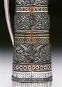 Acquired at the 1876 Centennial Exposition, this pitcher represents Tiffany’s new line of chromatically decorated silver utilizing mixed-metal techniques. It became the first piece of American silver to enter the Museum’s collection and distinguished the institution for its early interest in contemporary, as well as historic, art. Former Boston jeweler Gideon F. T. Reed, who was then a major shareholder in Tiffany & Co. and head of its Paris office, engaged Frank Hill Smith to select and acquire metalwork for the Museum from the Philadelphia fair. Despite an acknowledged conflict of interest, this pitcher became the first piece of Tiffany silver to enter a museum collection. And although the designer of this pitcher is unknown, a Tiffany drawing of this vessel, dated April 29, 1875, indicates that it was “pitcher no. 4065, [made from] four pieces, [with a] handle made of plate.”