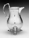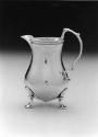 This gourd-shape creampot is similar in form to the previously cited example once attributed to John Allen. Austin has updated the C-scroll handle and ring foot of the older vessel by replacing them with a broken-scroll handle and three pad feet.