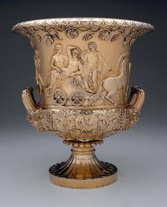 Both the form and the decoration of this cooler are based on precedents from antiquity; the vase is in the form of a Greek krater, and the Bacchic triumphal procession reflects a second-century Roman relief. The cooler was probably modeled after a design by William Theed, based on published engravings of antique vases. The retail firm of Rundell, Bridge & Rundell, suppliers to the prince regent, produced a number of variations of the model; this is the earliest known.